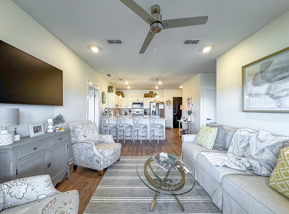 Equipped with must-haves like a fridge, microwave, oven, dishwasher, and washer/dryer hookups.